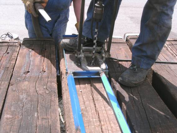 gebohrt werden. Bei aufgeplatteten Schwellen werden dazu zuerst die